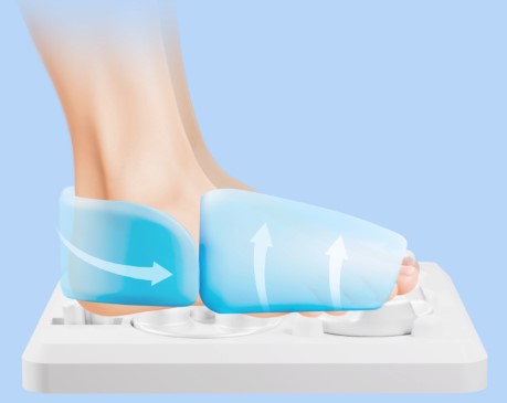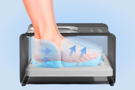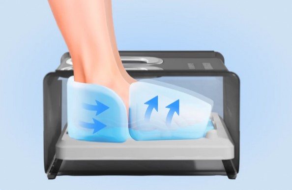 Аэроподушки мягко захватывают стопы, циклично увеличивая и ослабляя компрессию. При этом ноги надежно зафиксированы в анатомически правильном положении.
